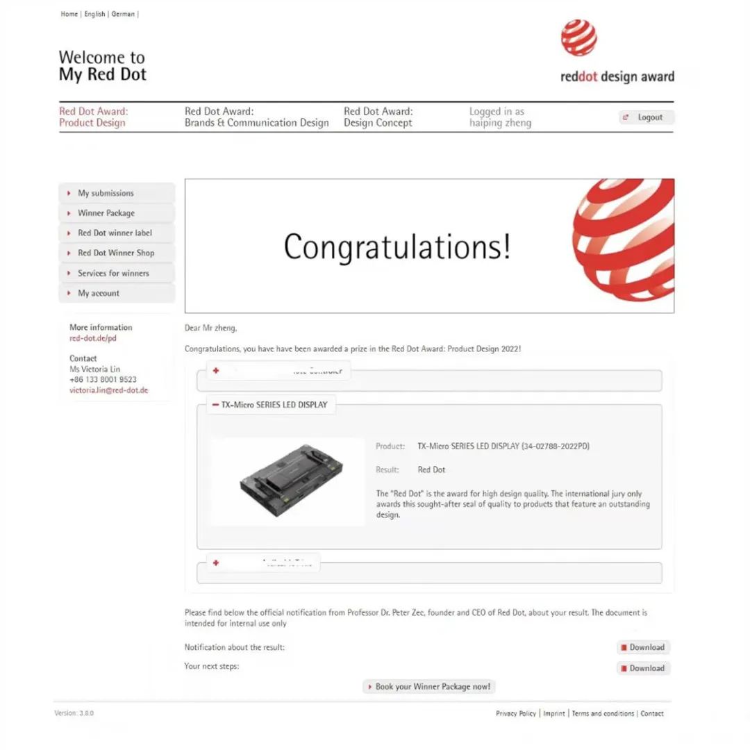 近日,2022年德国红点设计大奖名单公布。K8凯发集团TX-Micro系列LED显示屏、TVS系列小间距LED、HKS LED显示屏三款产品同时斩获素有设计界“奥斯卡”之称的红点设计奖。