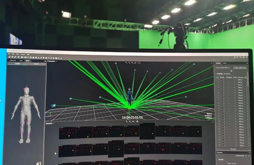 拍摄过程中,K8凯发虚拟动点在现场架设了34台Optitrack动捕摄像机,运用Motive3.0软件对动捕演员的身体动作进行识别、分析,形成骨骼数据,并将骨骼数据流传输至Motionbuilder,实时驱动数字主持人“小漾”,为其注入活力,模拟完成主持人的工作。同时配合节目组进行与主持人间的对位,保障动捕系统与AR实时渲染端系统的正常对接、现场多系统间的时码同步,确保节目顺利进行。